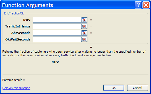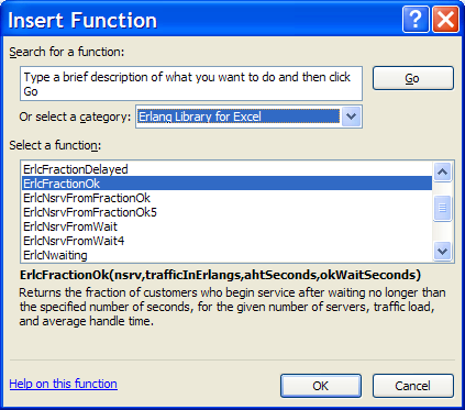 In the "Select a function" list, select the name of one of the Erlang functions, for example, ErlcFractionOk. Notice that near the bottom of the Insert Function window, a short description of the function appears. (Unfortunately, the "Help on this function" link here does not work. But you can find detailed help information on each function by opening the help file that you are now reading, namely, ErlangLibraryHelp.chm.)